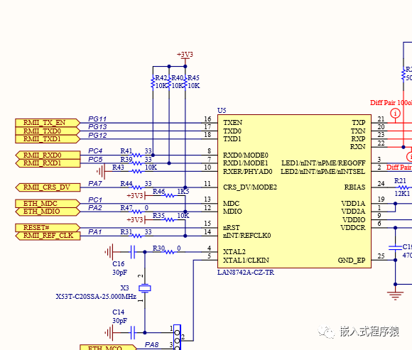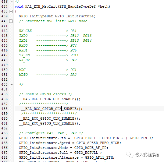 确定编译无误后,就可以动手移植了,首先要根据硬件原理图修改初始化部分,包括时钟,管脚,如果你的板子跟这个参考板很接近的话,那么移植起来很简单,看到原理图跟网络相关的硬件接口,可以对应到MCU侧。修改相应管脚初始化