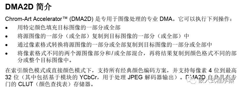 DMA2D是专门用于图像处理加速的DMA,我们在做屏的驱动时候可以充分考虑使用。