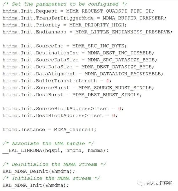 同样在QSPI外挂FLASH的操作中,同样可使用MDMA,换另一个通道,