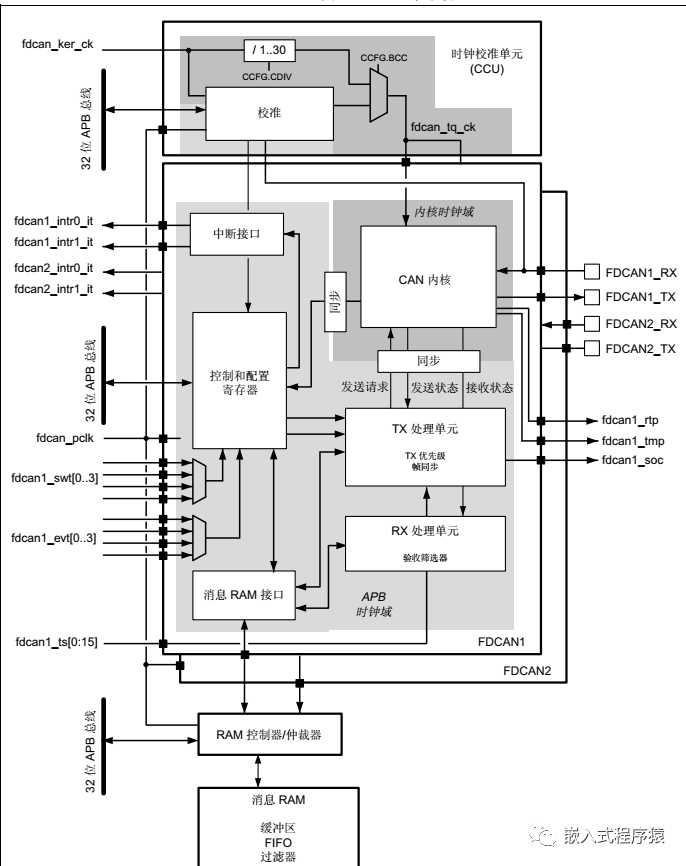 STM32H743的控制器局域网络 (CAN) 子系统由两个 CAN 模块、一个共享消息 RAM 存储器和一个时钟校准单元组成。关于这四个组成部分的基址,请参见存储器映射。两个 CAN 模块(FDCAN1 和 FDCAN2)均符合 ISO 11898-1: 2015(CAN 协议规范第 2.0 版A、 B 部分)和 CAN FD 协议规范第 1.0 版。此外,第一个 CAN 模块 FDCAN1 支持 ISO 11898-4 中规定的时间触发 CAN (TTCAN),包括事件同步时间触发通信、全局系统时间和时钟漂移补偿。FDCAN1 还额外包含专供时间触发功能使用的寄存器。CAN FD 选项可与事件触发和时间触发 CAN 通信一起使用。10 KB 的消息 RAM 存储器可实现过滤器、接收 FIFO、接收缓冲区、发送事件 FIFO、发送缓冲器( TTCAN 触发)功能。该消息 RAM 在 FDCAN1 和 FDCAN2 模块之间共用。通用时钟校准单元是可选的。通过评估 FDCAN1 接收到的 CAN 消息,该单元可基于 HSI 内部 RC 振荡器和 PLL 为 FDCAN1 和 FDCAN2 生成经过校准的时钟。