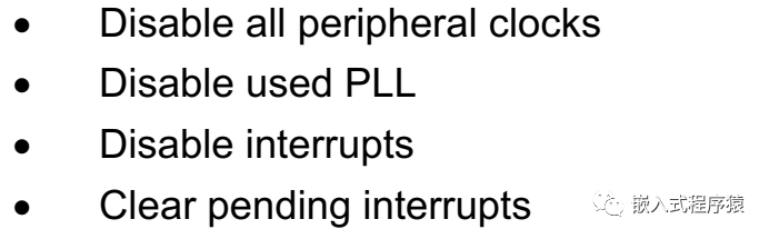 一般来说我们在进入跳转到bootloader时候需要做一些工作,STM32在进入系统bootloader时候需要做以下动作:关闭全局中断,时钟恢复配置为HIS,清除中断挂起标志,使能中断,设置跳转地址,执行跳转,可以是按键检测跳转,或者触摸操作跳转,这个根据自己的应用去实现。