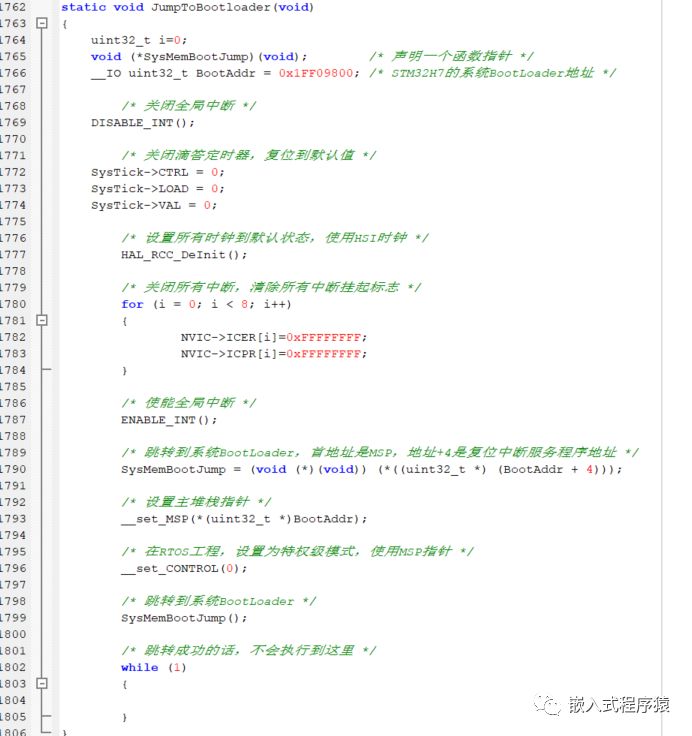 通过按照上面的说明我们就可以通过代码实现,只需要在需要跳转动作的地方调用下面的函数。注意ST官方给的系统bootloader系统地址不对,AN2606中给出的地址有误,使用时候要注意,需采用下面的地址,此处参考了安富莱例程,一并感谢。