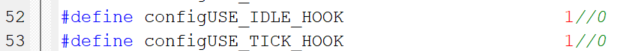 所以我们要使用这两个挂钩函数,必须先配置使能在freeRTOSConfig.h下