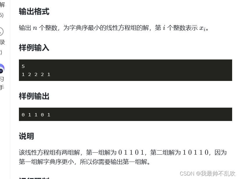 则应该使得x1==1,且因为一定存在一组解,则不需要再次判断x是否正确。如果x1==0能求出一组正确解则不需要再求x1==1的情况了,因为就算存在正解字典序也小于第一种情况。最后按照格式输出