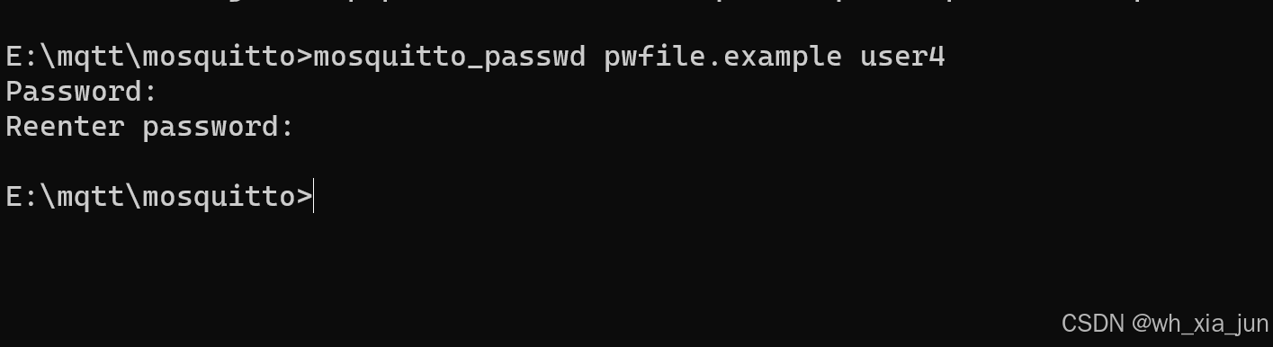 2. mosquitto_passwd -c pwfile.example 用户名:该命令相当于清楚所有的用户然后添加该用户mosquitto_passwd pwfile.example 用户名:该命令就是直接追加用户了那我这边就直接追加一个用户