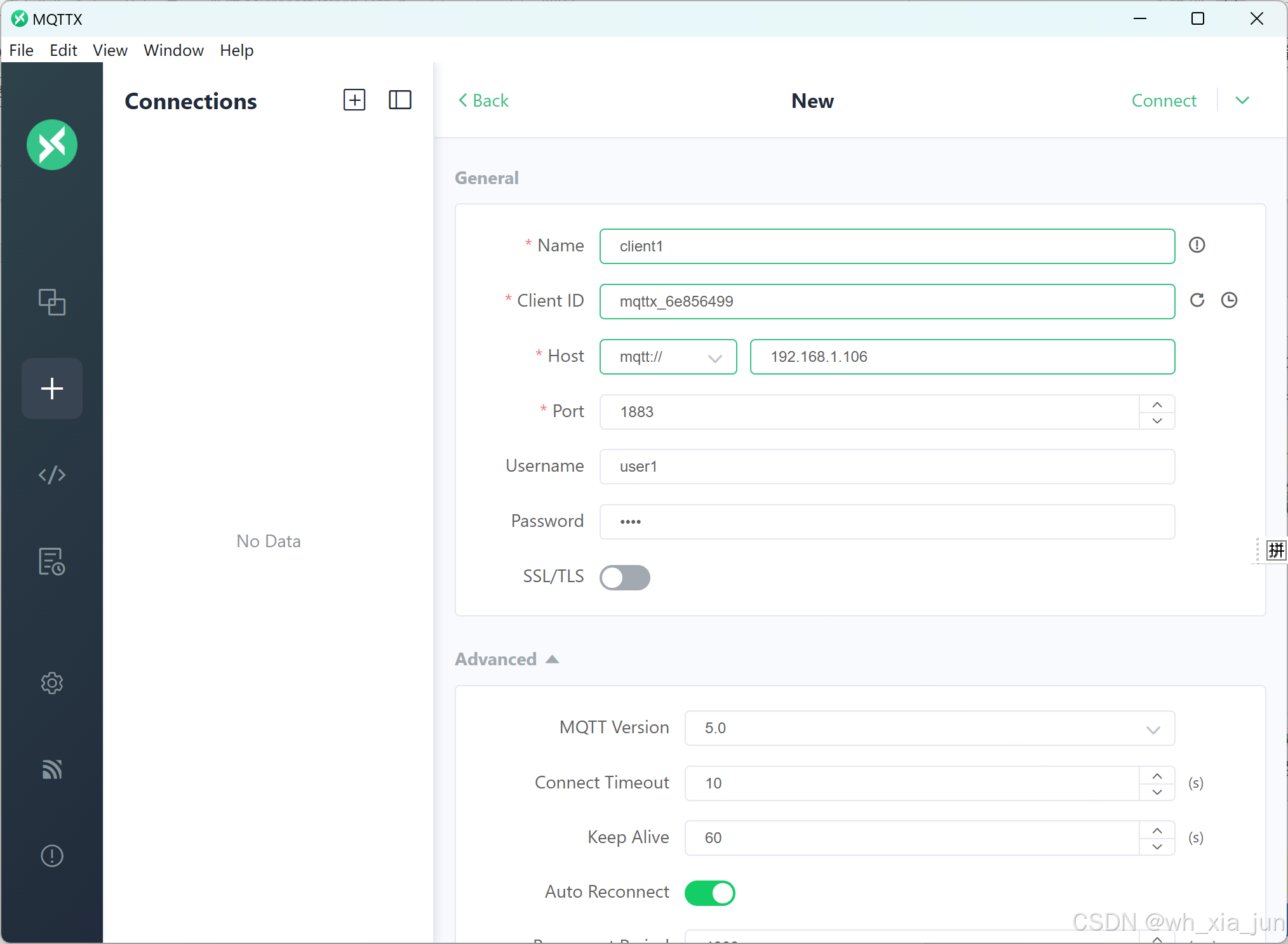 Name、Client ID随便填、Host的后面写入内网ip地址,也可就写入本机地址127.0.0.1,Username和Password要填入正确的,我这边填入的就是user1connect就行了。