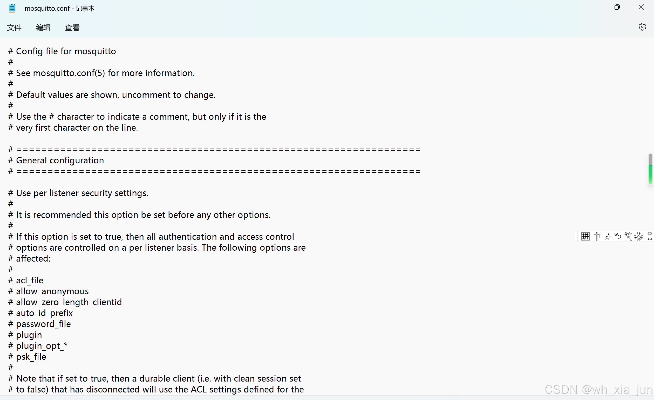 在最下方(可以在任意位置修改),主要要修改三个值第一个是listener:该值的格式为 端口号/ip地址(mqtt默认的端口号是1883)我就写1883了,那我的listener就是1883/192.168.1.106 第二个allow_anonymous该值是是否允许匿名登入我这边写的是false就是不允许匿名登入,填入true就是允许匿名登入;第三个是password_file该值的意思是用户信息的位置,我的位置就是在该目录下所以我的写入的值就是E:\mqtt\mosquitto\pwfile.example