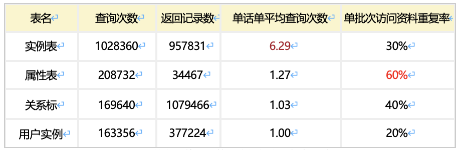 为了细致分析业务实际访问的操作,团队迅速完善了业务数据访问接口的调用链埋点,实现了表级别的接口数据采集。同时,对访问维度进行了数据接口级别的埋点,特别关注了关键维度如销售品、用户和实例等。通过对163355条话单的测试分析,我们获得了以下关键数据: