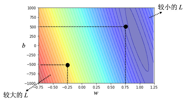 以不同的参数计算损失值,画出的等损失线图称为误差表面(error surface),可以直观看出参数取值与损失值的关系。