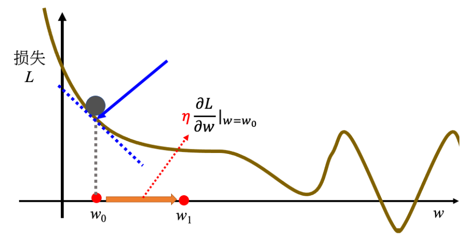 w1=w0−η∂L∂w∣w=w0w^1 = w^0 - \eta \frac{\partial L}{\partial w} |_{w=w^0}w1=w0−η∂w∂L∣w=w0