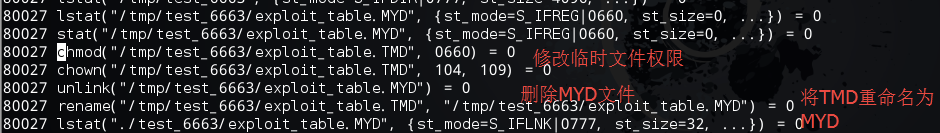 在此漏洞中首先对MYD文件进行了lstat()操作获取其权限信息,然后对TMD文件进行chmod()操作,将获取的权限信息赋予TMD,若lstat后将TMD文件换为符号链接,连接到攻击者可控文件,攻击者即可进行权限提升。