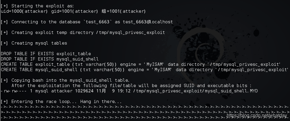 新建exploit_table表,并将MYD文件指定存储到/tmp/mysql_privesc_exploit中,删除mysql建立的MYD,以attacker身份新建MYD, 然后Repair exploit_table, 在repair的过程中会生成TMD文件,通过赢得竞争将TMD文件设置为指向mysql_suid_shell.MYD的符号链接,因为TMD的权限与MYD相同,MYD的权限可由attacker控制,从而实现修改mysql_suid_shell.MYD的权限为04777(set-uid+exec),然后启动mysql_suid_shell.MYD即可