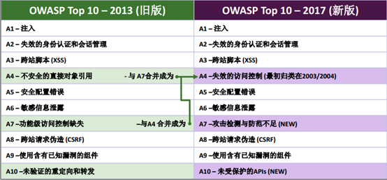 - 合并了2013-A4“不安全的直接对象引用”和2013-A7“功能级访问控制功能缺失”到2017-A4“无效的访问控制”。