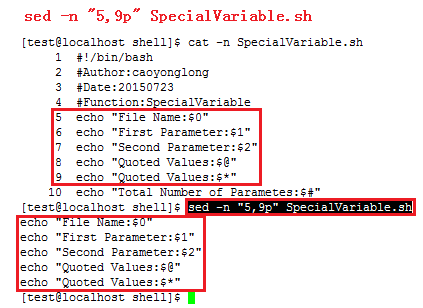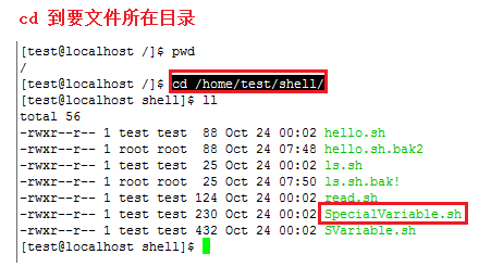 cd 到要文件所在目录。cd到要查看指定行数内容的文件所在目录,本文以SpecialVariable.sh文件为例,cd /home/test/shell/,如下图