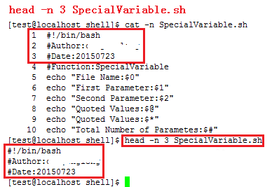 head -n 数字 文件名,表示查看文件前几行的内容,比如查看SpecialVariable.sh的前3行内容,