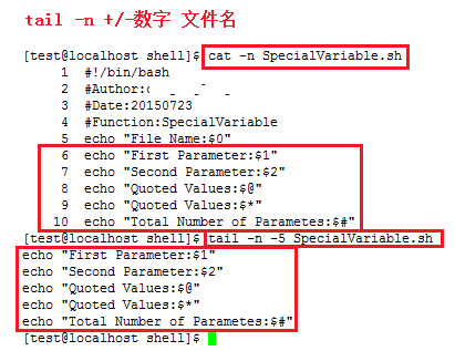 tail -n -数字 文件名,表示查看文件的最后几行,比如查看SpecialVariable.sh的最后5行,