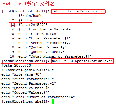 tail -n +数字 文件名,表示查看文件的某一行到最后一行,比如查看SpecialVariable.sh的第3行到最后一行,