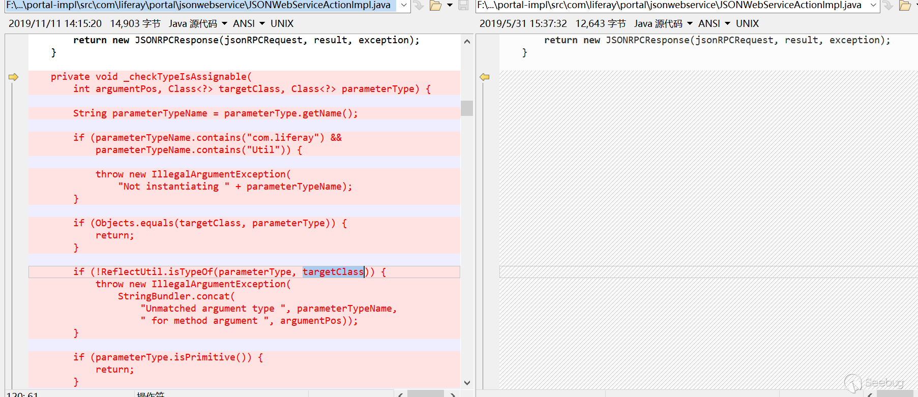 Liferay补丁增加了类型校验,在com.liferay.portal.jsonwebservice.JSONWebServiceActionImpl#_checkTypeIsAssignable中: