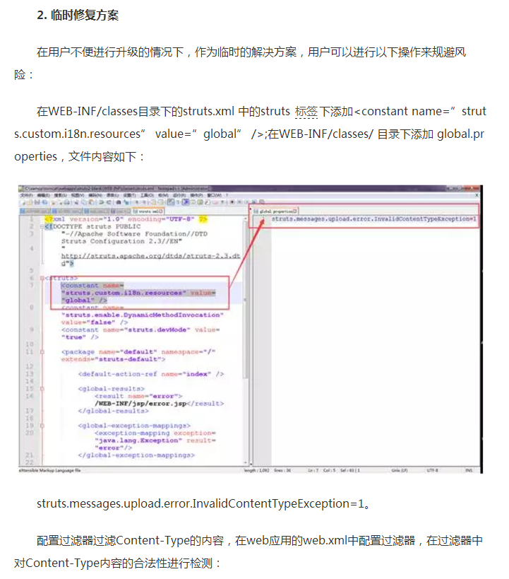 根据Apache Struts2官方反馈,对于该风险未给予新的安全公告编号,只建议用户关闭devMode模式(在配置文件中将devMode设置为false)。用户可参照如下进行修改:
