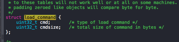 Load Commands 直接就跟在Header后面,所有command占用内存的总和在Mach-O Header里面已经给出了。在加载过Header之后就是通过解析LoadCommand来加载接下来的数据了。定义如下: