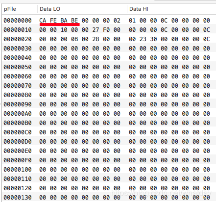 1. 第一段为magic 魔数,这里注意大小端,读出来之后需要看下是0xCAFEBABE还是 0xBEBAFECA(否则即为thin),需要根据这个来转后续读取的字节的字节序。 可以看出来 前4byte 为 0xBEBAFECA ,说明为fat。