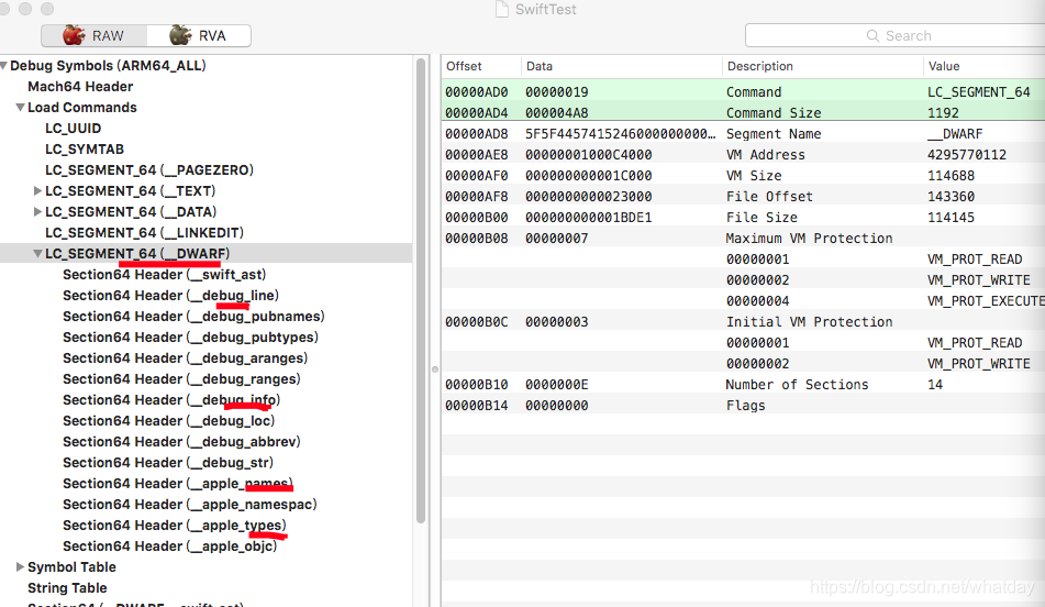 TEXT的vmaddr也就是程序的加载地址; —DWARF中表明了DWARF数据块的信息,表示dSYM是DWARF格式的数据结构。