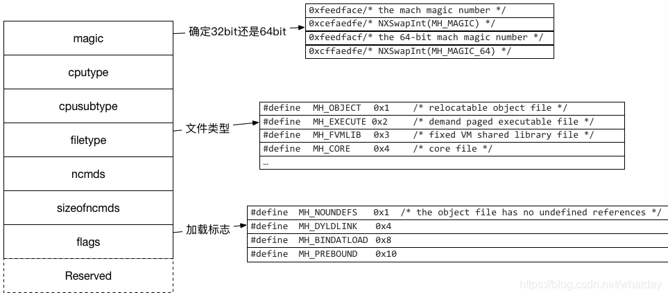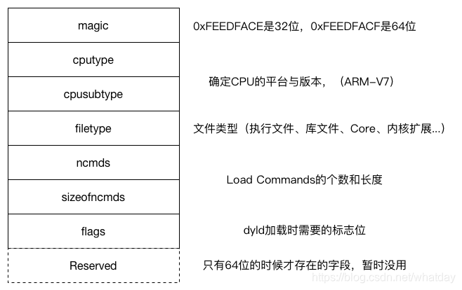 `sizeof(struct mach-header-64) = 32byte` ; `sizeof(struct mach-header) = 28byte`