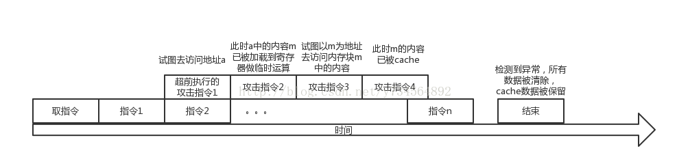 a的内容被送入寄存器中参与临时运算,尝试以a的内容做地址去访问某块内存,导致该地址内容被cache;一个周期结束时,被检测出非法指令,所有数据被清除,但是cache中并未擦除;此时对整个内存进行扫描,测试访问速度,地址x访问时间极短说明该地址被cache,进而推断出a地址中的内容为x。