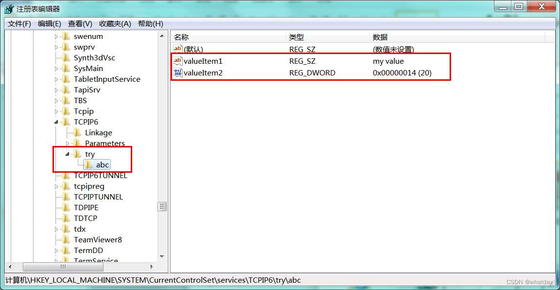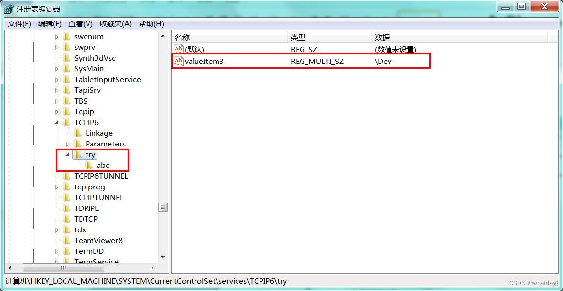 REG支持递归创建新的键(子键),只要在RegistryPath中加入想创建的键(子键)即可。例如使用如下语句在TCPIP6下创建子键try,并在try下创建子键abc。