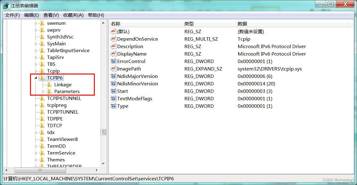 - 左侧展开的层次结构就是键路径,可以理解为目录,一个键就是分支中的一个目录,而子键就是这个目录中的子目录。子键同样是一个键,因为子目录下还可以有子目录。下图中的“TCPIP6”和“Linkage”就是键(子键)。