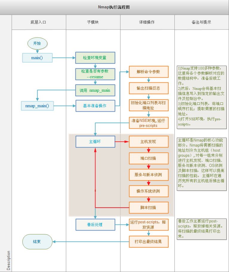 4)main()函数负责处理三种类型的脚本扫描:预扫描(SCRIPT_PRE_SCAN)、脚本扫描(SCRIPT_SCAN)、后扫描 (SCRIPT_POST_SCAN)。预扫描即在Nmap调用的最前面(没有进行主机发现、端口扫描等操作)执行的脚本扫描,通常该类扫描用于准备基本的信息,例如到第三服务器查询相关的DNS信息。而脚本扫描,是使用NSE脚本来扫描目标主机,这是最核心的扫描方式。后扫描,是整个扫描结束后,做一些善后处理的脚本,比如优化整理某些扫描。
