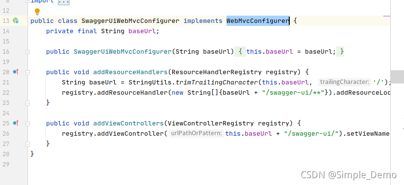 一开始找到swagger3.0 的SwaggerUiWebMvcConfigurer类中addViewControllers方法根本断点就没进去,资源都找不到所以404呀,这怎么行。所以只能一点点通过find usage终于定位到问题了