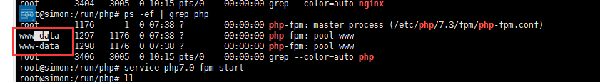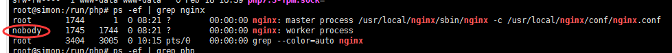 此时发现nginx的拥有者为nobody,php-fpm的拥有者为www-data,如遇到了nginx用户要访问php文件,则此时却是就没有了权限。