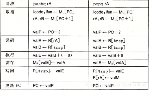 - 译码 (instruction decode):通过寄存器ID,从前面寄存器文件中读取程序寄存器rA,rB的值,pushq指令会读取%rsp