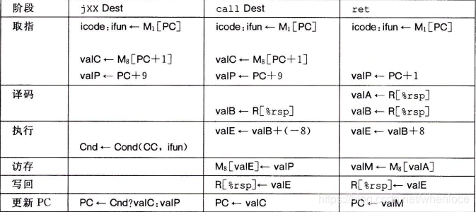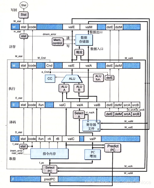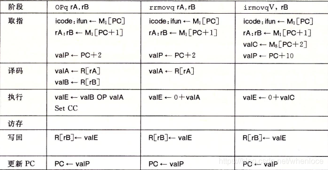 - 取指 (instruction fetch): 从内存读取指令,通过code:function确定指令类型和指令功能,同时取得一个或两个寄存器ID(rA或rB),也可能是立即数,通过当前PC和指令长度计算下一条地址,保存在valP中