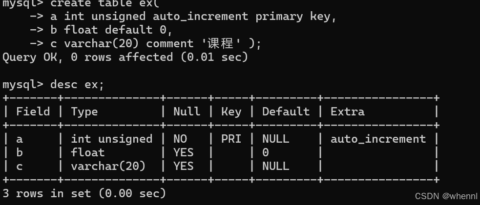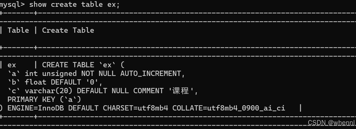 注意:优先进入数据库再进行创建,字符集不设置的话为默认值。