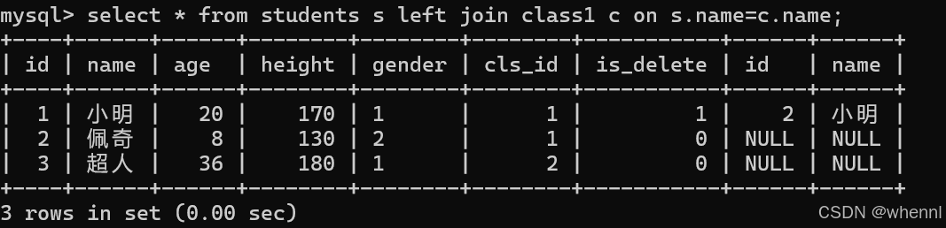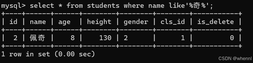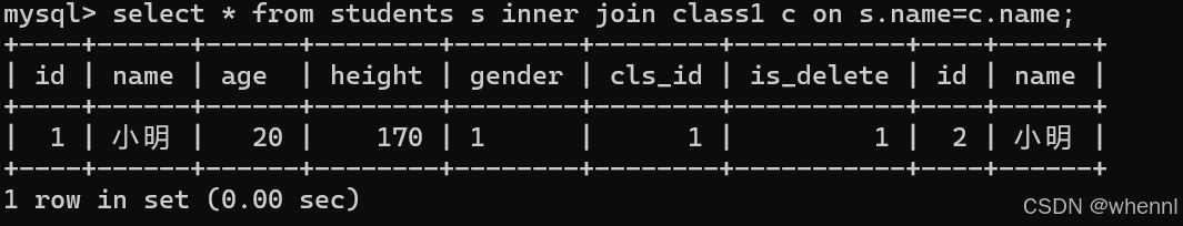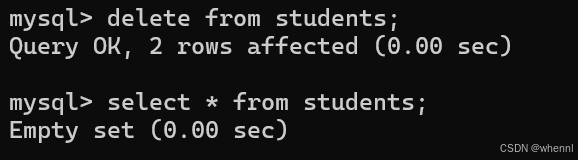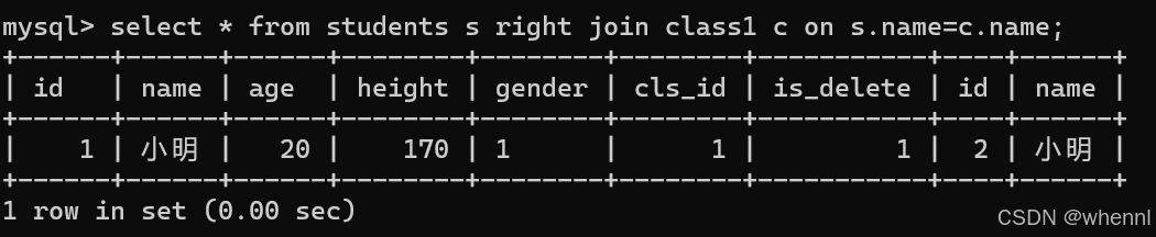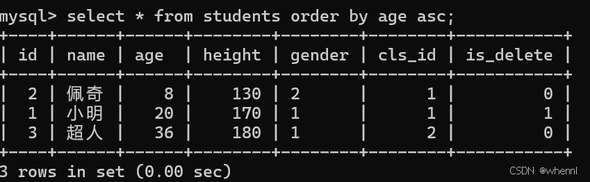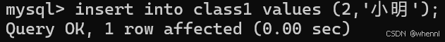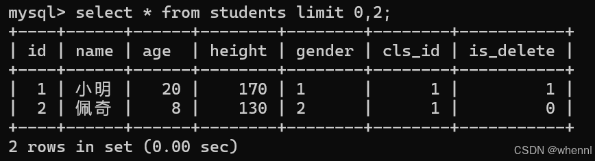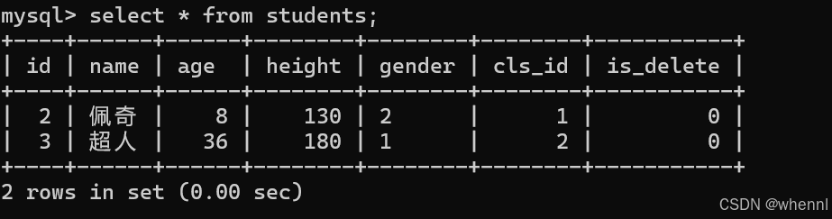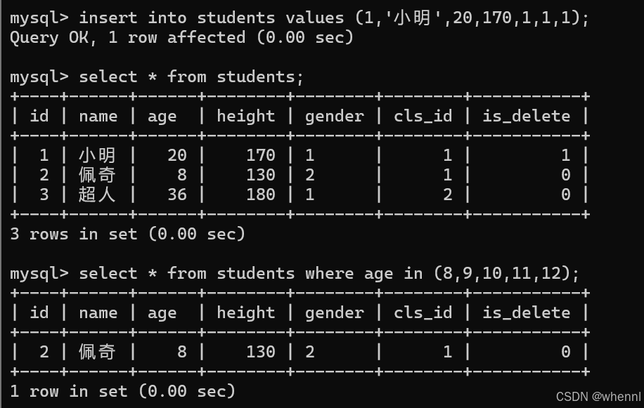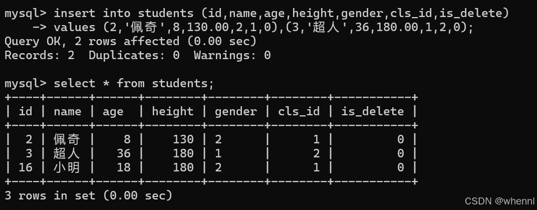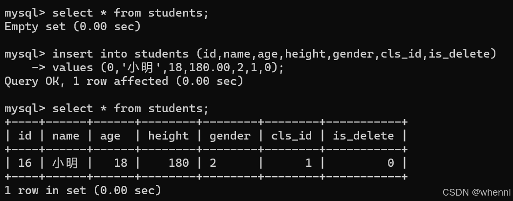 注意:插入一行数据也可以写成 insert into students values (0,'小明',18,180.00,2,1,0)