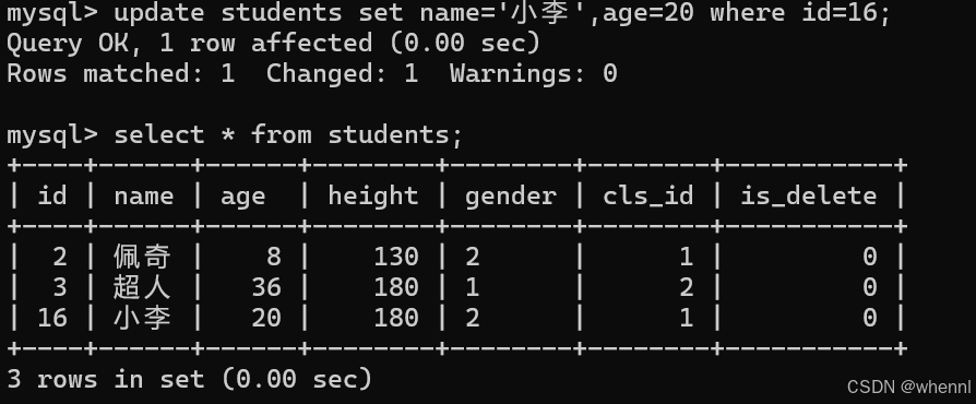 示例:将id为16的学生名字改成小李,年龄改成20。