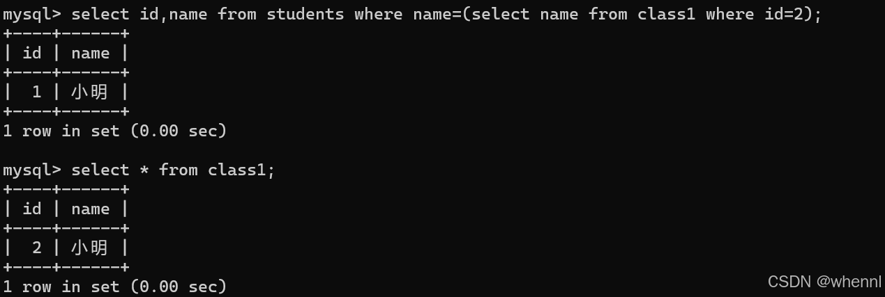 前半段是正常的查询语句,name=()中为子查询语句,查询的字段为name,查找yunwei表中age为20的name,结果为张三,将结果执行外部的查询语句,就完成了。