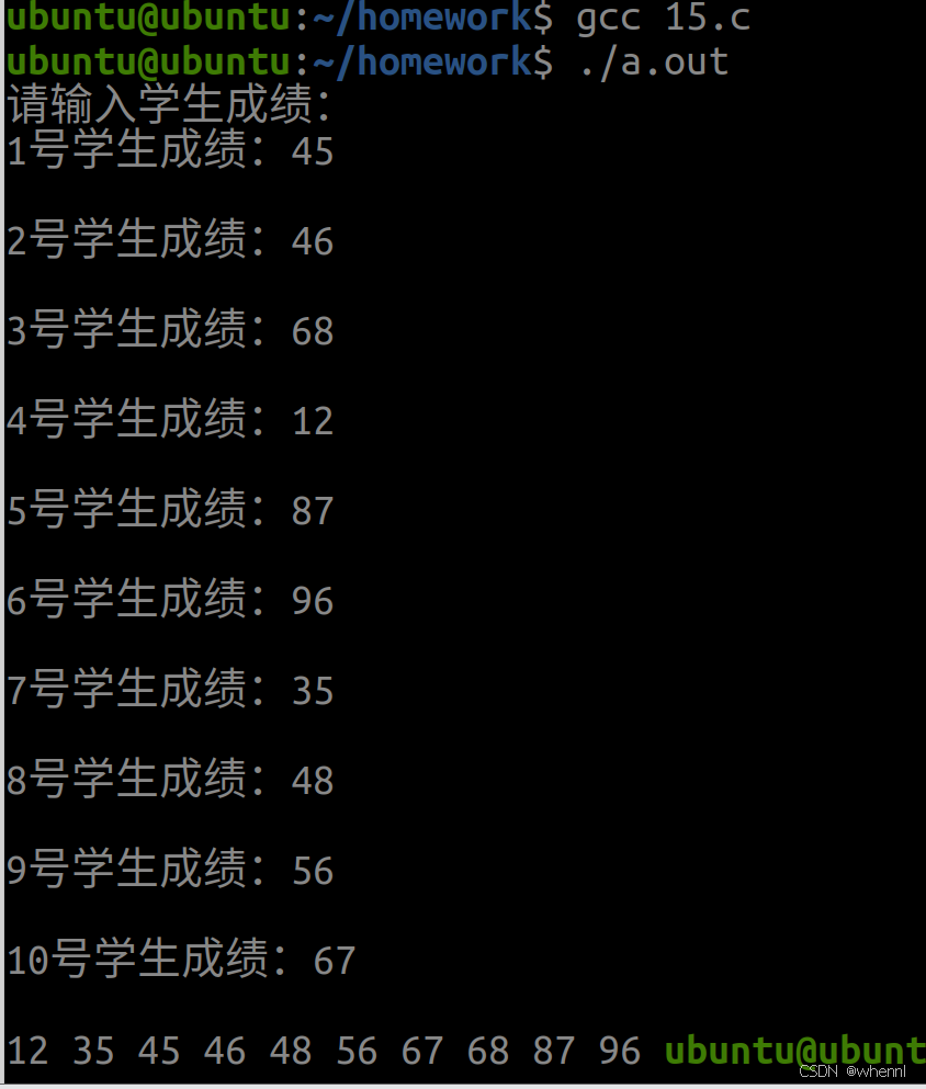 终端输入10个学生成绩,使用冒泡排序对学生成绩从低到高排序