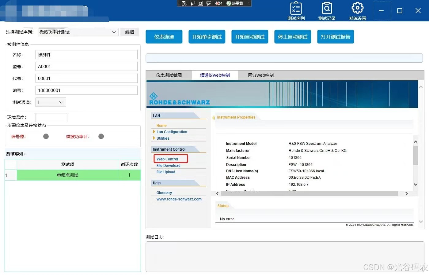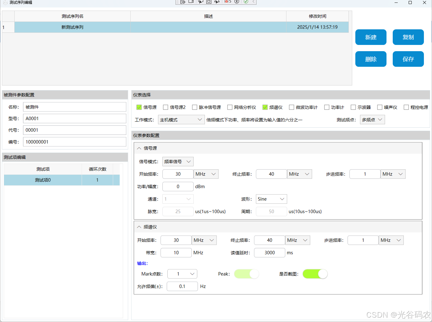 项目使用wpf开发,使用了自己封装的仪表控制库,该库支持多种通信仪表,包括频谱仪、信号源、功率计、示波器等等。仪表控制命令采用xml脚本保存,可进行新增、修改。