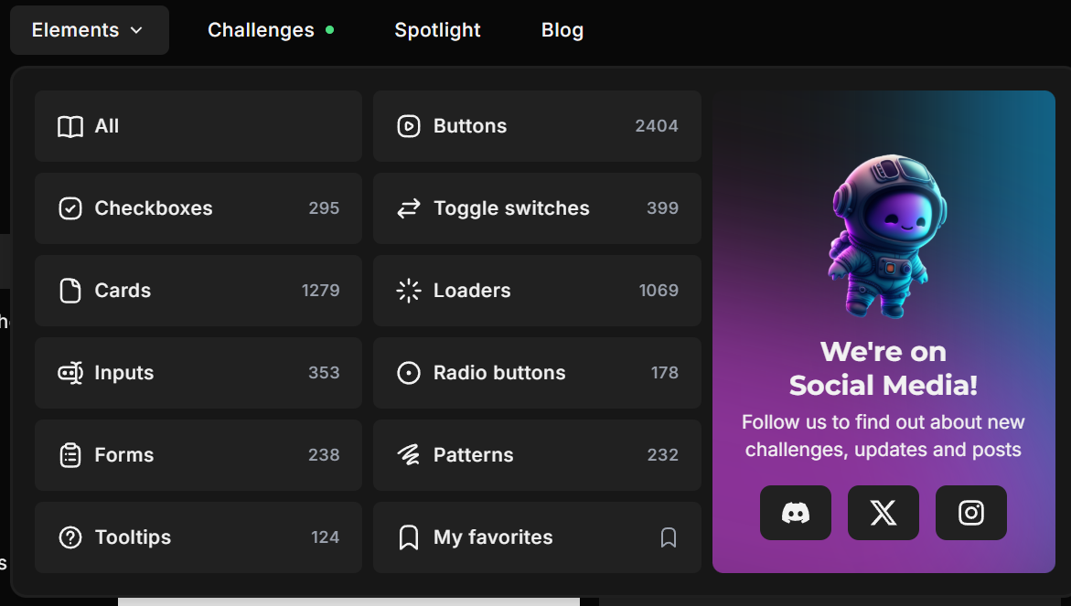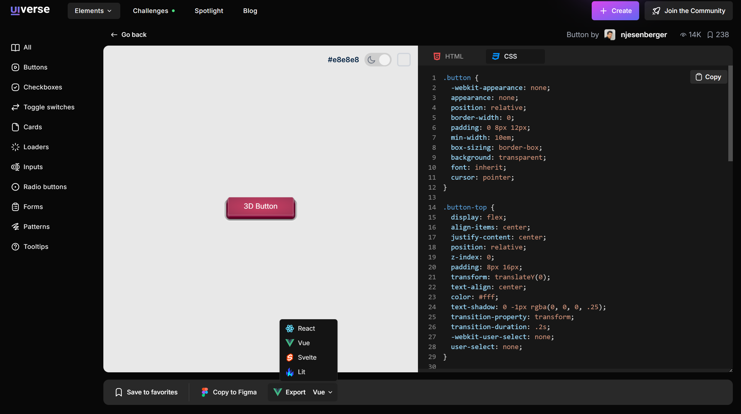 开发者可以将自己设计的 UI 元素上传到 Uiverse,与全球开发者分享创意。这种开放的社区模式不仅丰富了组件库的内容,也为开发者提供了展示才华的平台。