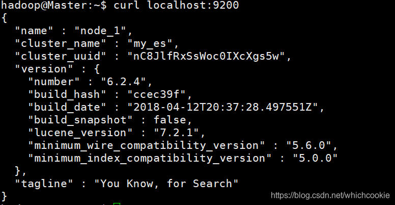 三台机器启动完毕后,在任意一台机器上输入curl localhost:9200进行验证。
