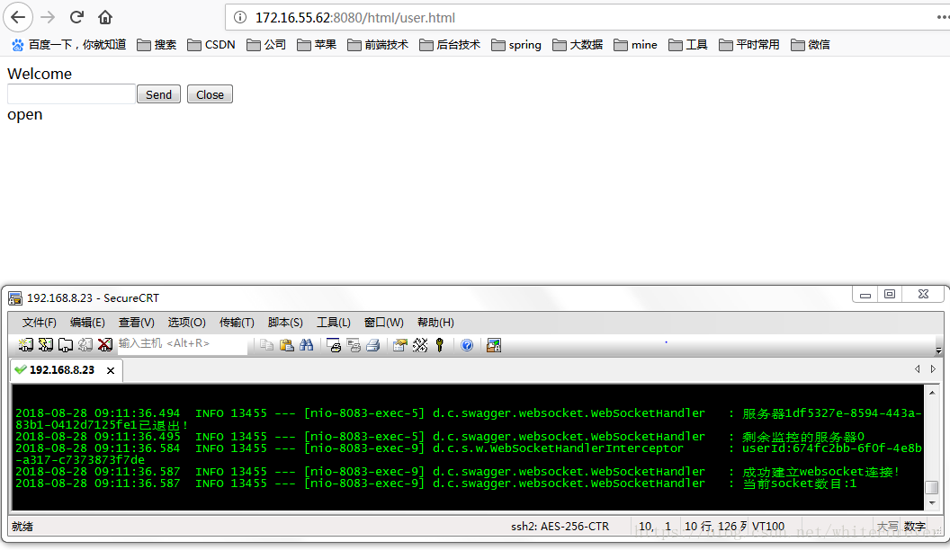 访问在window访问websocket页面 然后查看其中一个服务器的日志