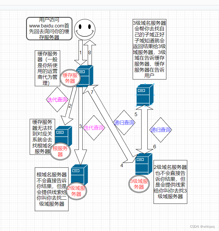 用户到子域名过程为迭代查询,子域名到用户过程为递归查询