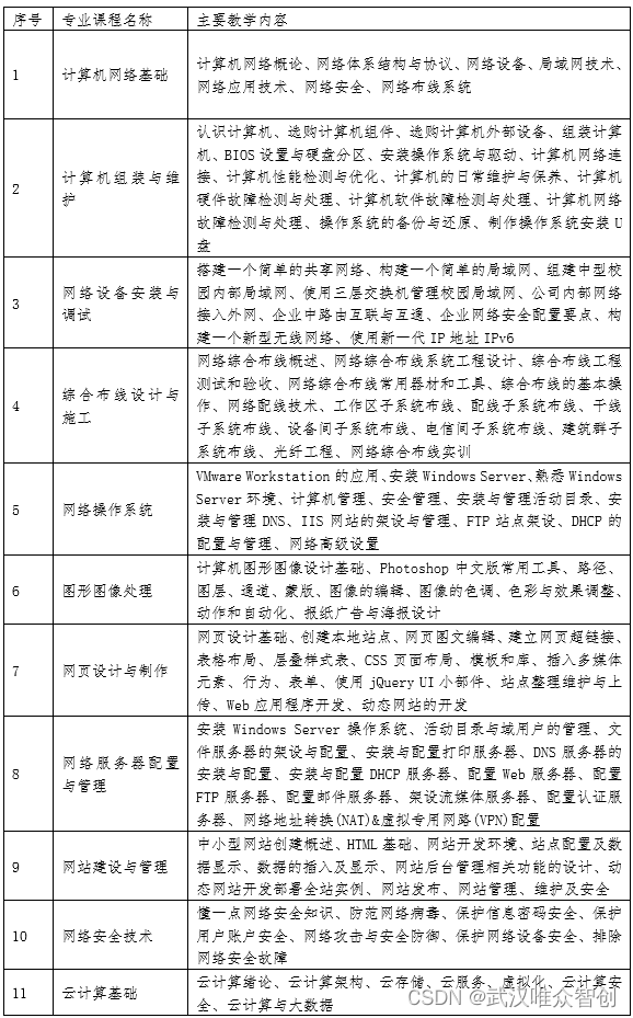 本专业面向计算机网络技术的集成与应用领域,培养从事网络组件、网络设备安装与调试、网络系统维护与管理、网络产品营销以及相关产品销售等工作,德智体美全面发展的高素质劳动者和技能型人才。