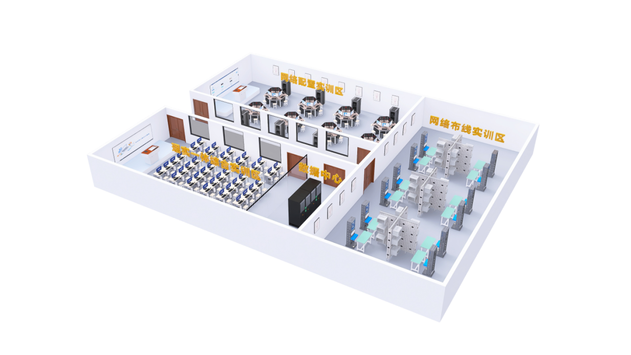 网络布线实训区:满足计算机网络专业布线安装的实验学习,通过在综合布线七大子系统内的线缆、管槽、配件实训,实现网络底层物理架构的联通,主要通过综合布线实训模拟墙、铜缆光缆实训台实现。
