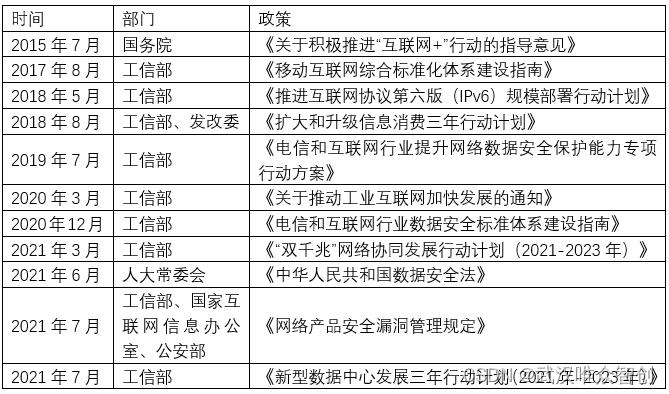 从我国互联网规划政策颁布的历程来看,从“十一五”规划开始,我国在政策层面开始提出互联网发展相关规划,建设互联网示范工程。“十三五”规划中提出了“互联网+”产业的相关概念,我国互联网迎来蓬勃发展,互联网产业也成为了“十三五”规划期间的重点发展产业。“十四五”规划中的发展重点在数字经济等新兴科技技术,也均立足于互联网产业。下面是2015-2021年间互联网络国内政策汇总: