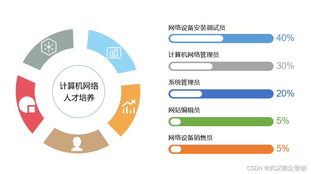具体岗位包括:网络设备安装调试员(40%)、计算机网络管理员(30%)、系统管理员(20%)、网站编辑员(5%)、网络设备销售员(5%)。